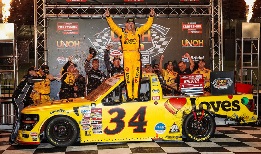 BRISTOL, Tenn. — Layne Riggs recovered from a first-lap spin at Bristol Motor Speedway and rallied to win Thursday night’s UNOH 250 Presented by Ohio Logistics, the second race in the NASCAR CRAFTSMAN Truck Series Playoffs.